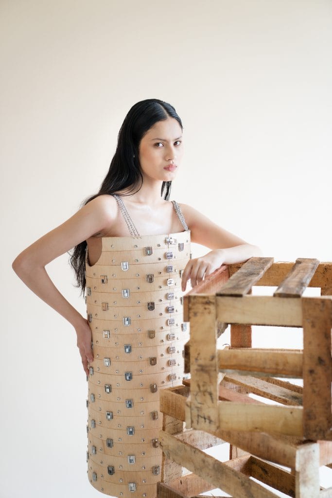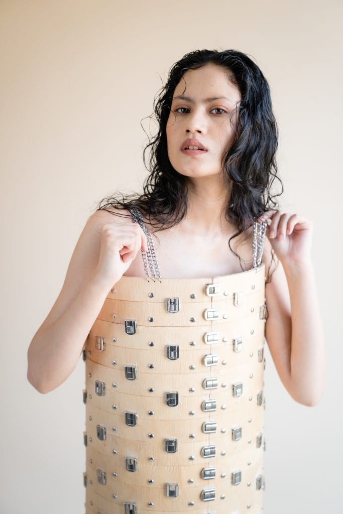 The wooden elements are not mere accents or accessories, they are the structure, guiding the design and anchoring each form. Yet within this strength lies a certain delicacy. Parmar’s silhouettes never feel heavy or ornamental. Instead, they evoke a quiet power, allowing the body to animate the material rather than be consumed by it.